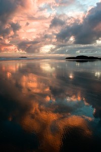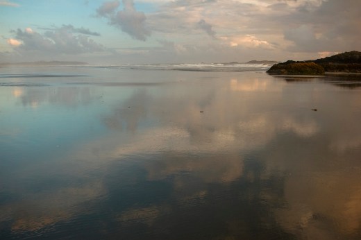 Wet sand and partly cloudy skies are a good combination for a nice photograph. Time of day is another important consideration. Often, the best lighting is when most people are sleeping or eating. Dawn and dusk are not only the best times for lighting, but wildlife is most active too. During mid day this beach was busy with beachcombers, but by 8pm everyone had gone back to camp. To get the best shots photographers usually sacrifice a ‘normal’ schedule to be in position for the best light.