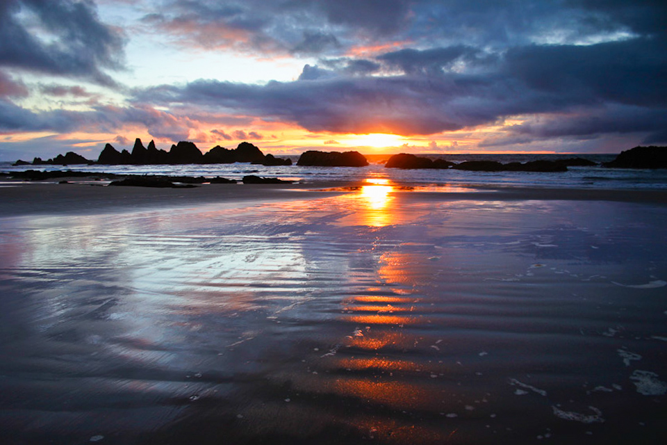 The Central Oregon Coast offers many great locations for shooting sunsets. There are lots of rock outcroppings and seastacks to add interest and variety to the composition. All of Oregon’s beaches are open to the public, there are no private beaches here. So you have your choice of about 350 miles of coastline. Access is a different story however, some popular beaches have large parking lots with board walks and wheelchair access, others may require a long hike and route finding skills. Seal Rock has a nice parking lot and short trail to the beach. Access is easy and photo ops are good especially when there is a break in the clouds and the tide is out.